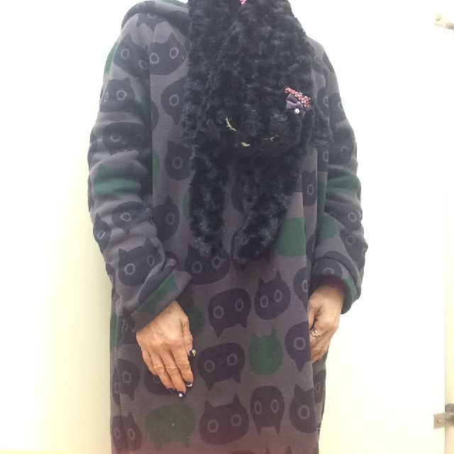 猫のぷーちゃんマフラーのオモテ側は、毛足の短い黒色ので出来ています。